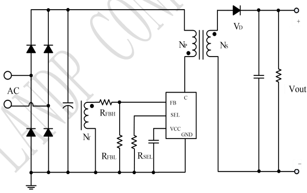 峰值電流設(shè)置通過SEL腳外接電阻RSEL實(shí)現(xiàn),可調(diào)最大峰值電流IPKMAX。恒流控制和輸出恒流電流設(shè)置通過檢測(cè)電感的峰值電流實(shí)現(xiàn),當(dāng)原邊電感中的實(shí)時(shí)電流大于芯片設(shè)定的最大峰值電流IPKMAX時(shí),功率管關(guān)斷。輸出電流IOUT與變壓器的匝數(shù)比、峰值電流和退磁時(shí)間等因素有關(guān)。