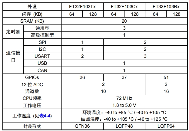 FT32F103x8/B 微控制器集成了高性能的 Arm? Cortex?-M3 32 位 RISC 內(nèi)核,工作頻率為 72 MHz,內(nèi)嵌高速存儲(chǔ)器 (高達(dá) 128 KB 的閃存和 20 KB 的 SRAM),以及大量的增強(qiáng)型 I/O 和連接到兩條 APB總線的外設(shè)。所有器件都提供兩個(gè) 12 位 ADC、三個(gè)通用 16 位定時(shí)器和一個(gè) PWM 定時(shí)器,以及標(biāo)準(zhǔn)和先進(jìn)的通信接口:多達(dá)兩個(gè) I2C、兩個(gè) SPI、 三個(gè) USART、一個(gè) USB 和一個(gè) CAN。