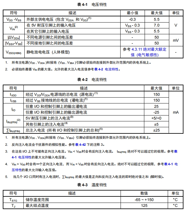 表4-1列出了電壓特性,表4-2列出了電流特性,表4-3列出了溫度特性。這些數(shù)據(jù)對(duì)于確保器件在安全范圍內(nèi)工作至關(guān)重要。