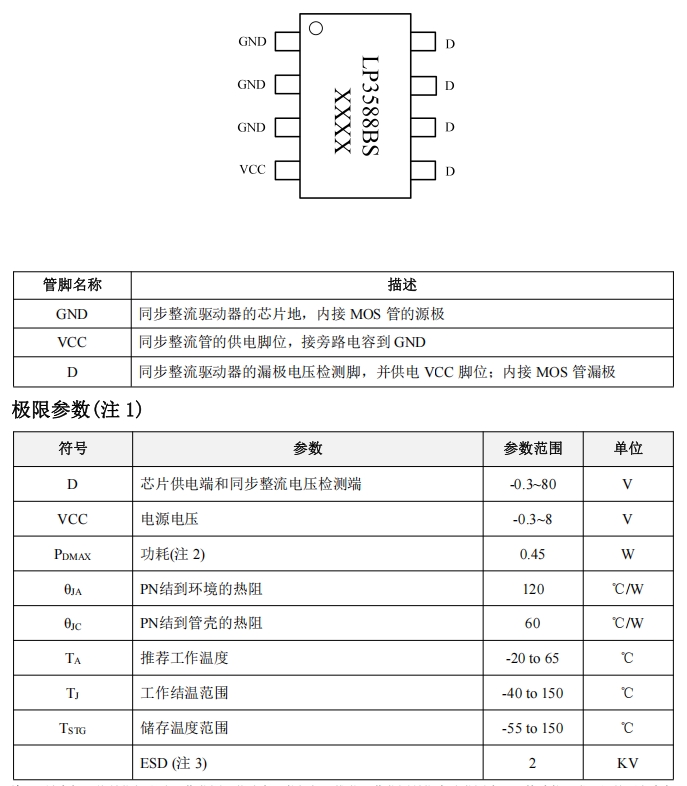 LP3588BS采用SOP8L封裝,具有緊湊的尺寸和良好的散熱性能。以下是其管腳功能描述: