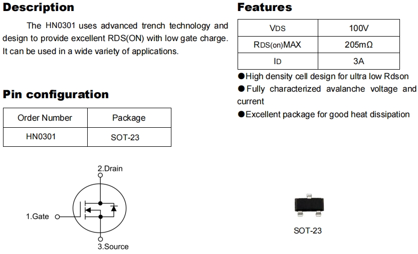 在 60 W 以下的開關(guān)電源、馬達(dá)驅(qū)動(dòng)或電池保護(hù)板上,工程師往往希望找到一顆“既耐壓又高開關(guān)速度、同時(shí)封裝足夠小”的 MOSFET。華能(HN)推出的 HN0301 把 100 V 耐壓、205 mΩ 低導(dǎo)通電阻和 3 A 連續(xù)電流塞進(jìn)了一顆 SOT-23 三腳小封裝,成為 24 V 工業(yè)母線、12 V/24 V 汽車周邊、POE 受電設(shè)備等場(chǎng)景的新寵。本文結(jié)合原廠數(shù)據(jù)表與實(shí)測(cè)筆記,帶你1分鐘吃透這顆“迷你功率管”。