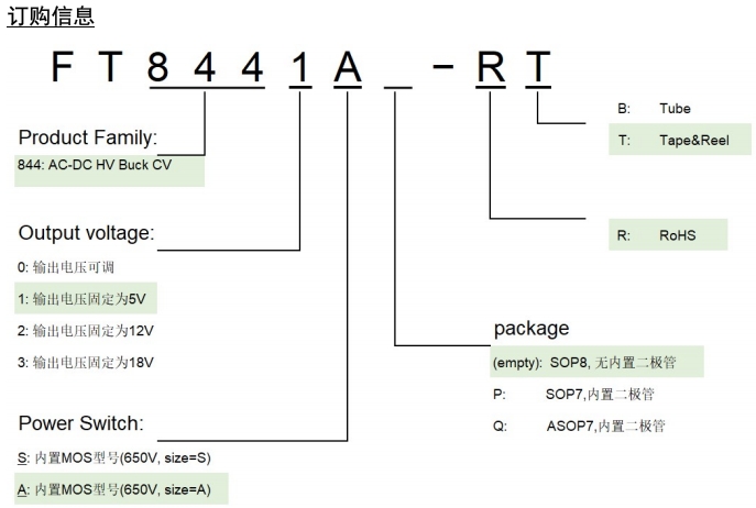 FT8441S:適用于 Buck 結構,持續輸出電流為 250mA,封裝形式為 SOP8。