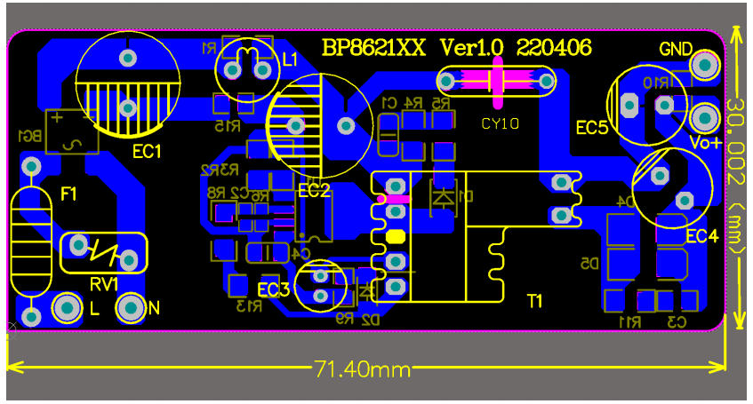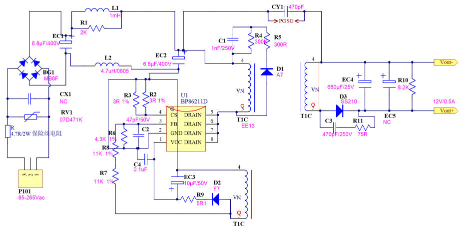 在 5 W-10 W 功率段的家電輔助電源里,工程師最想要的是:省器件、低成本、一次過 EMI、馬上能量產(chǎn)。深圳三佛科技提供的 BP86211D 參考設(shè)計(jì),用 單顆 SOP-7 芯片 + 650 V 集成 MOSFET,官方實(shí)測 12 V/0.5 A(6 W),待機(jī)功耗 < 65 mW,BOM 僅 24 顆器件,單面板即可過 CISPR22 Class B 傳導(dǎo)。本文帶你從特點(diǎn)、電路圖、實(shí)物、BOM、變壓器到測試數(shù)據(jù),完整拆解這套“家用電器即插即用級(jí)”方案。