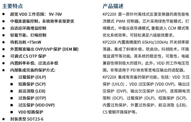 | 工作頻率 | 22-120 kHz 可調(diào),谷底鎖定 | QR+FFM 雙模式,效率 93%+ |