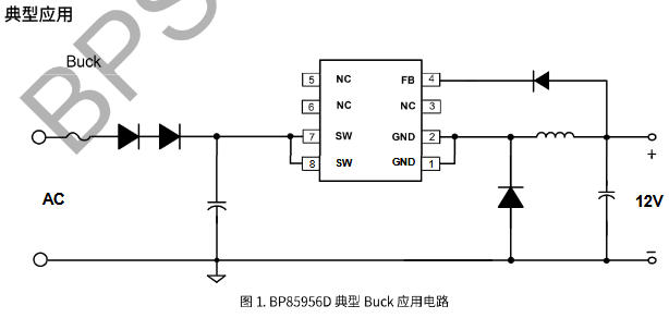 SOP-8封裝,絲印“BP85956D”下面還有一行小字“YYWWX”,內(nèi)部批次碼。管腳定義如下(頂視圖逆時針):